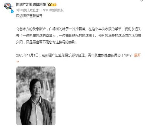2025年11月1日,前新疆广汇篮球俱乐部总经理、青年队主教练曹新同志(1949.10.15-2025.11.1)因病与世长辞。新疆篮球的天空,有一颗星悄然隐没。