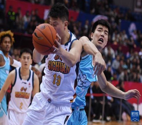 12月15日,四川丰谷酒业队球员苏若禹(右)在比赛中防守青岛崂山啤酒队球员王睿泽投篮。新华社记者 李紫恒 摄